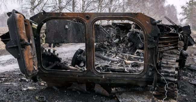 Остатки сгоревшей бронемашины БМП на пути в Мотижено