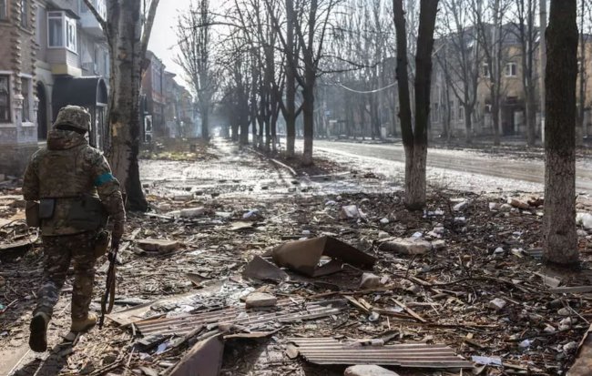 Военные на почти разрушенных улицах Бахмута