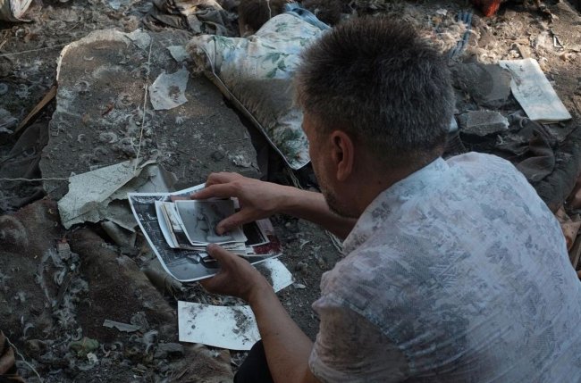 Мужчина собирает фотографии своих родных, разбросанные возле разрушенной пятиэтажки, Николаев