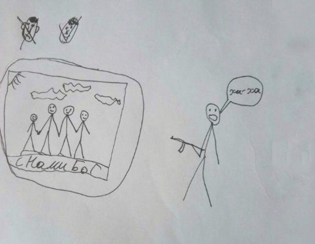 Сын после обыска нарисовал рисунок, на котором стоит человек с автоматом и рядом наша семья, и написал внизу «С нами Бог».