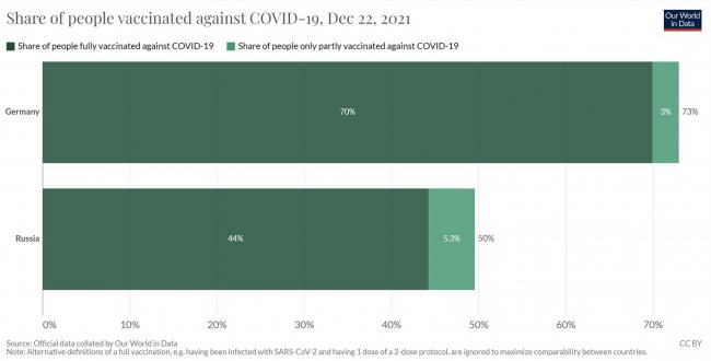 По регулярно обновляемым данным сервиса Our World in Data, который берет данные из официальный источников, на 21 декабря в Германии как минимум одной дозой вакцинировано 73,5% населения, полностью вакцинировано 70,5%, а бустерную (третью или вторую в случае с вакциной Johnson & Johnson) дозу получили 32,7% жителей. Врачи считают, что бустерная доза стала особенно важна в связи с распространением штамма коронавируса «омикрон», который легко заражает даже полностью вакцинированных. В России же, по сведениям из того же источника, хотя бы одной дозой вакцинировано 50,2% жителей, двумя — 44,8%, а бустерной дозой — всего 4,6%. Таким образом, Россия является одной из наименее вакцинированных стран Европы, наряду с Болгарией и Украиной.