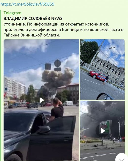 Владимир Соловьев распространил через свой Telegram-канал сообщение из канала первого замминистра информации так называемой ДНР Даниила Безсонова. Там говорилось об успешном ракетном ударе российских вооруженных сил по украинской военной части в городе Гайсин Винницкой области. Сообщение проиллюстрировано двумя видеороликами и одной фотографией.