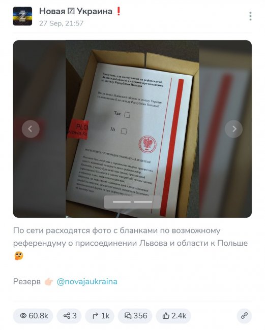 В интернете распространяются сообщения о подготовке референдума в Львовской области. Согласно им, предполагается решить вопрос о вхождении ее в состав Польши. Многочисленные Telegram-каналы с буквами Z и V в названиях распространяют фото заготовленных бюллетеней с утверждениями, будто коробки с бюллетенями доставлены в Львовскую областную администрацию.