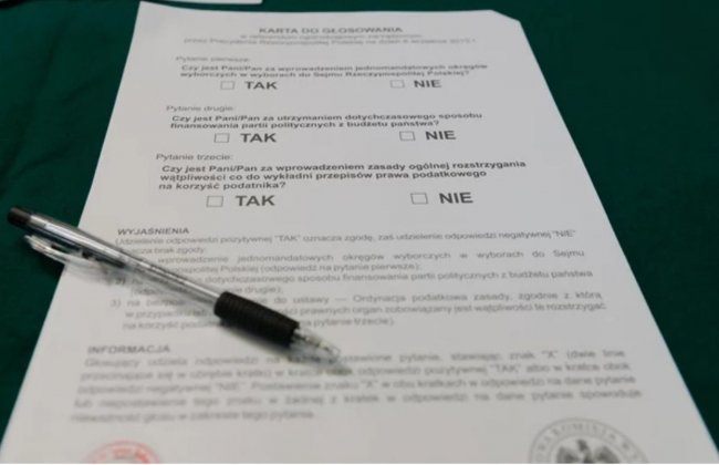 Дизайн бюллетеней совершенно не похож на принятый в Польше. Для сравнения, вот бюллетень польского референдума 2015 года об изменении избирательной системы, финансировании партий и толковании налогового законодательства (признан несостоявшимся из-за низкой явки избирателей).
