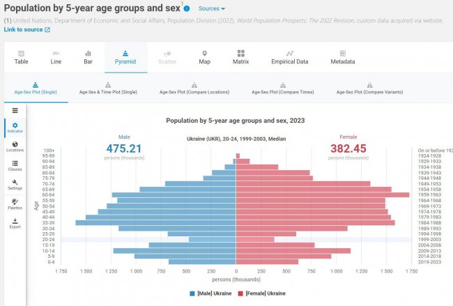 Данные статистического департамента ООН действительно подтверждают происходящее. Еще в прошлом году медианное значение численности двадцатилетних жителей Украины (и девушек, и юношей) достигало примерно 200 тысяч человек в каждой категории пола. А данные за нынешний год показывают, что юношей в возрастной категории 21 года осталось около 60 тысяч, а девушек и того меньше — где-то 50 тысяч. Представляете, какое падение численности всего за год! <…>