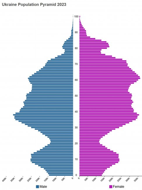 «Это действительно ужасно, если вы посмотрите на демографическое дерево Украины. Там действительно очень мало населения в возрасте двадцати с небольшим лет. У России аналогичная проблема. Двадцать лет назад был конец 1990-х, развал Советского Союза, действительно тяжелые времена, особенно в Украине. Люди просто откладывают рождение детей. Таким образом, мы имеем дело с потерей 33% населения, даже без учета войны».