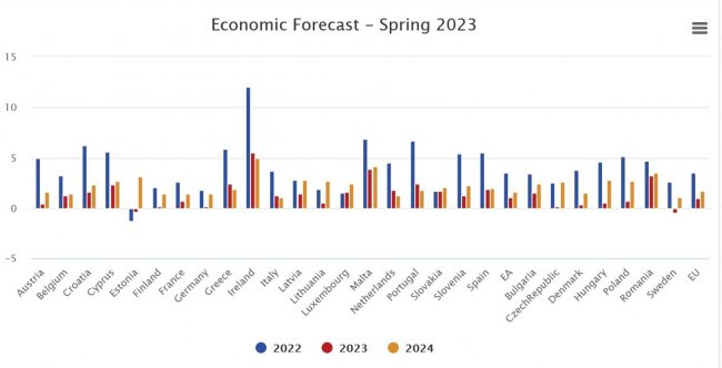 Опубликован также и прогноз по каждой из стран ЕС. Падение ВВП по итогам 2023 года ожидается только в двух из них — Швеции (на 0,5%) и Эстонии (0,4%). Во всех остальных ВВП вырастет; самый большой рост прогнозируется в Ирландии (5,5%). В крупнейших экономиках ЕС ожидается небольшой, но все же рост ВВП: в Германии на 0,2%, во Франции на 0,7%, в Италии на 1,2%. В 2024 году предвидится рост ВВП во всех странах ЕС.