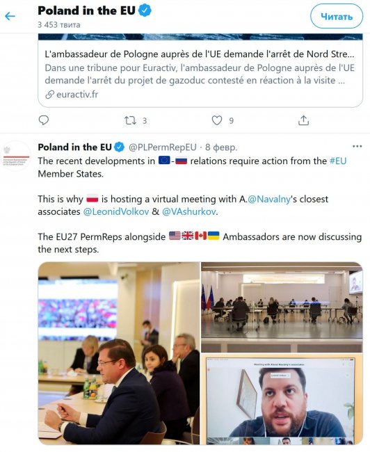 В действительности представительство Польши в ЕС организовало видеоконференцию, в которой участвовали представители 27 стран Евросоюза, Великобритании, Канады, США, Украины, а также Леонид Волков и Владимир Ашурков. Фотографию именно этой конференции, опубликованную в Twitter представителем Польши в ЕС Анджеем Садосем, привела в Facebook Захарова.
