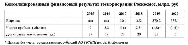Финансовые показатели самой государственной корпорации Роскосмос далеки от первоначальных планов. По плану по итогам 2019 года выручка должна была составить 444–445 млрд рублей, а чистая прибыль — достичь 10–12,5 млрд рублей, но корпорация к этим показателям даже не приблизилась.