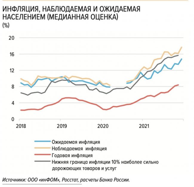 В глазах граждан рост цен выглядит еще хуже. «Наблюдаемая населением инфляция», согласно опросу, который был заказан ведомством Эльвиры Набиуллиной, составила 17,7%, причем люди, не имеющие сбережений, дали еще более высокую оценку – 18,5%. С июня 2021 года около 18% опрашиваемых респондентов считают, что цены за год выросли как минимум на 30%. Год назад лишь 10% воспринимали ситуацию настолько драматично. Наибольшее раздражение вызывает рост цен на мясо и птицу – в декабре 57% заявили, что за месяц они подорожали «очень сильно».