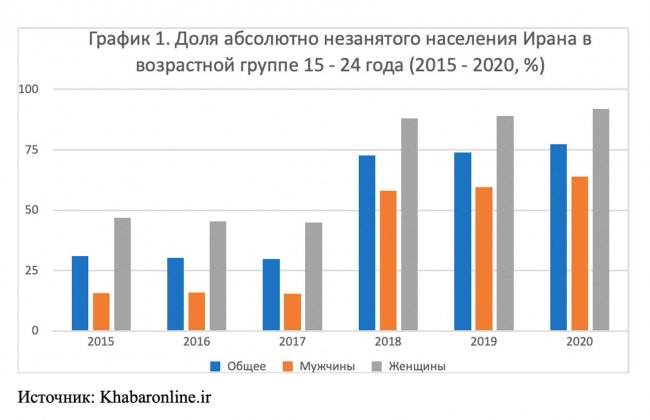 По оценкам иранских экономистов, уровень безработицы среди женщин составляет 13%, в то время как среди мужчин он примерно вдвое ниже (7,2%). Эти цифры вдвое выше среди молодых людей в возрасте от 18 до 35 лет. По другим данным, доля безработных среди людей в возрасте от 15 до 24 лет достигает 77% (7,1 млн человек) (график 1). Существует также гендерное неравенство в сфере занятости. Например, только каждая пятая женщина участвует в экономике.