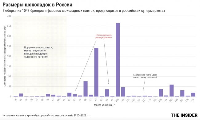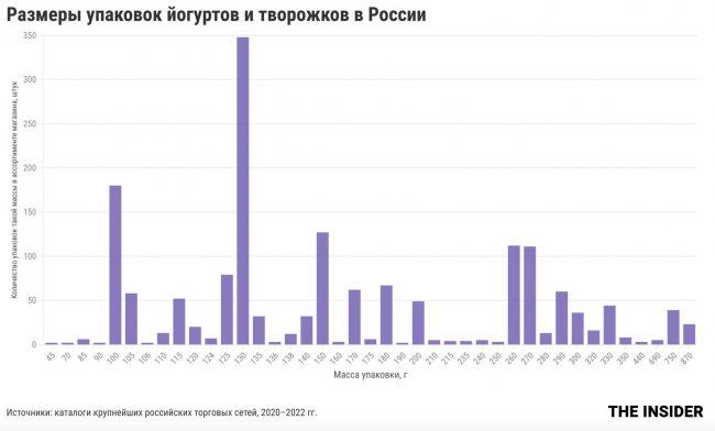 Изучая каталоги товаров и их исторические фасовки, The Insider нашел много примеров, когда между популярными, более «стандартными» вариантами фасовок (например, литр молока или масла, килограмм риса или муки, пол-литра пива или сто граммов шоколада) возникают уменьшенные, неровные значения. Они не появляются, к примеру, в фасовках вина, макарон, воды, детского питания, конфет или кормов для кошек и собак, однако очень часты в коробках, стаканчиках и бутылках молочных продуктов, пачках круп, соусов, шоколада и консервов.