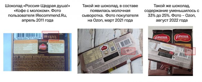 А вот плитки под брендом «Россия — щедрая душа!» (принадлежит Nestle) растаяли не во рту и даже не в руках. За десять лет от 100-граммовой плитки осталось только 82 г, при этом состав шоколада значительно ухудшился.