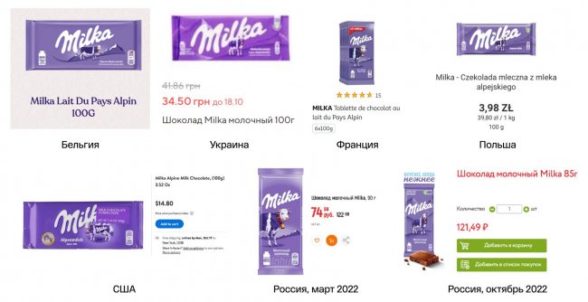 Такая же участь постигла и бренд шоколада, который можно купить в любой стране Европы и в США — Milka. Еще в марте 2022 года плитка классического молочного шоколада, произведенного под брендом в России (компания «Мон'дэлис Русь») весила 90 г, однако к октябрю она стала весить уже 85 г. Хотя производитель утверждает, что дело в тренде на здоровое питание, The Insider выяснил, что Milka столько весит только у российской дочерней компании. Для сравнения, в октябре 2022 года вес аналогичной шоколадки в других странах составляет 100 г.