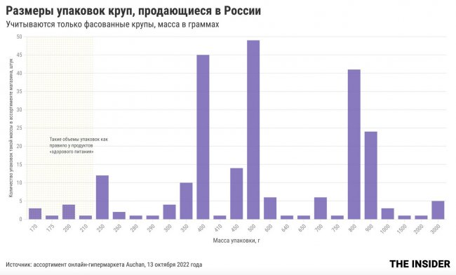 В среднем по России килограмм обычного риса сейчас стоит 115 рублей, гречки — 134 рубля, отчитывается Росстат. Однако таких упаковок в магазинах почти нет. The Insider проанализировал каталоги популярных торговых сетей за 2020–2022 годы и выяснил, что чаще всего крупы фасуют в упаковки по 400, 500, 800 и 900 г. За последние 2 года появились и промежуточные варианты — 450 и даже 410 г, 300 и на 10–40 г меньше, 700 и на 50–100 г меньше. Именно так работает «сжимфляция»: пачки товаров «худеют» незаметно, по несколько процентов за раз.