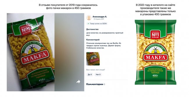 Например, макароны бренда Makfa появились в упаковках по 400 г. Хотя раньше типичной была пачка в 450 г. Это заметили даже покупатели товаров на маркетплейсе Ozon.