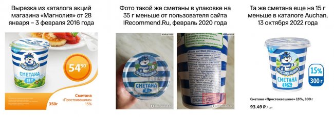 Уменьшаются объемы и дргих продуктов Danone. Сметана «Простоквашино» в 2022 году фасуется в стаканы по 300 г, хотя еще в 2020–2021 годах масса сметаны в такой же упаковке была 315 г, а пять лет назад — 350 г.