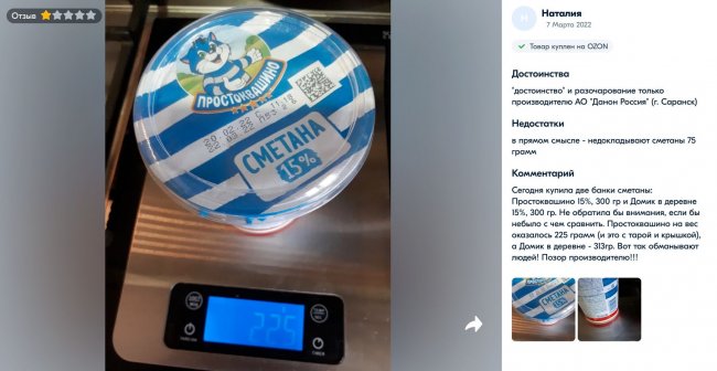 Однако покупатели продукции утверждают, что в 2022 году производитель перестал гарантировать даже эти 300 г. The Insider нашел среди отзывов на Ozon фотосвидетельство того, что в упаковке сметаны намного меньше.