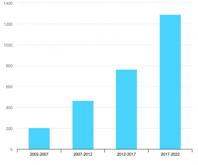 Ввод мощностей ВИЭ в мире в 2002–2022 гг., ГВт