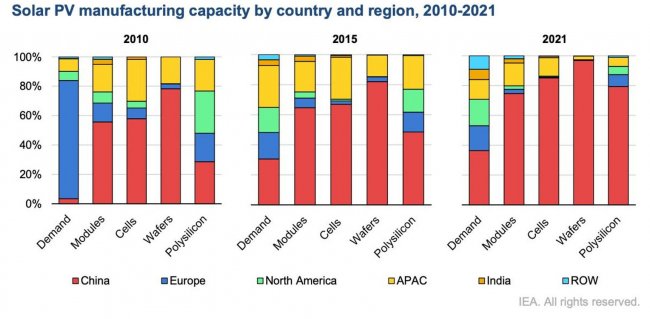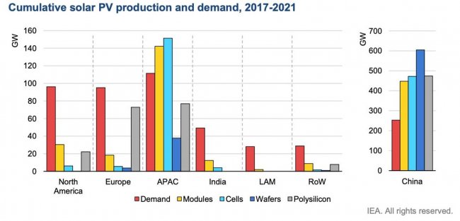 В июле 2022 года МЭА выпустило отчет об угрозе доминирования Китая на рынке солнечных панелей. Опасения организации связаны с тем, что некоторые звенья производственной цепи почти полностью зависят от китайских компаний.