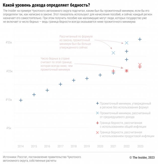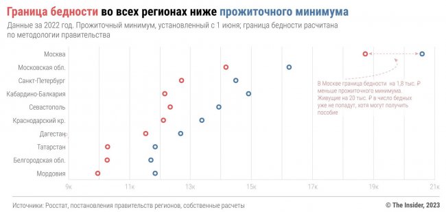 В конце того же 2021 года правительство придумало еще один показатель — «граница бедности». По ней считают число бедных в стране. Это не те бедные, которые могут рассчитывать на выплаты, но те, кого включают в статистику по бедности в России. Вычисляется граница бедности через стоимость той самой минимальной потребительской корзины в IV квартале 2020 года, умноженной на накопленную инфляцию, причем для регионов ее определяют только раз в год. Новый коэффициент позволил отчитаться, что бедных в 2022 году стало еще на 1,7 млн меньше.