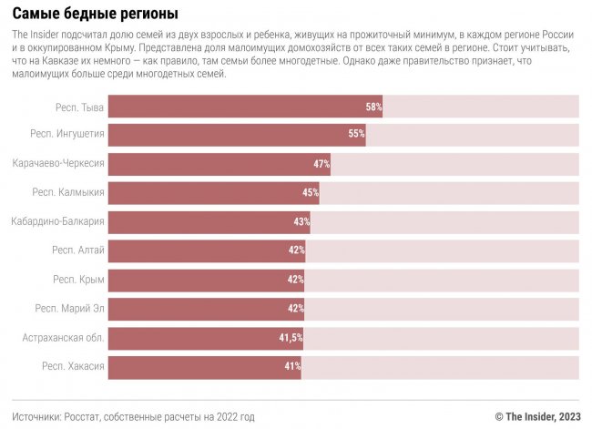 Оказалось, что в Тыве и Ингушетии больше половины семейных пар даже с одним ребенком имеют доходы ниже прожиточного минимума. При этом в обоих регионах, согласно последней переписи, семьи чаще многодетные или имеют хотя бы двух детей — то есть на самом деле доход двух родителей делится между большим количеством человек, и домохозяйство оказывается еще беднее. Как минимум 40% семей являются малоимущими в Карачаево-Черкесии, Калмыкии, Кабардино-Балкарии и еще нескольких регионах.