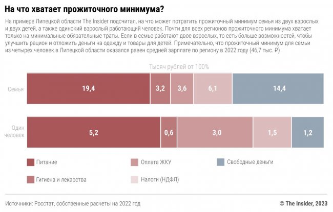Определенный по новой методологии Росстата прожиточный минимум во второй половине 2022 года в среднем по России составил 13,9 тысячи рублей — от 11,6 тысячи в Липецкой области до 31,7 тысячи на Чукотке. В той же Липецкой области минимальный набор продуктов (мы посчитали его по старой методологии Росстата) обошелся бы в 5,2 тысячи рублей, еще где-то 3–3,6 тысячи — квартплата, около тысячи — на базовую гигиену. Из оставшихся пары тысяч рублей, большая часть уйдет на НДФЛ (ведь прожиточный минимум рассчитывается до вычета налогов), и последние несколько сотен, вероятно, можно потратить на транспорт. На аренду жилья, внезапные расходы типа пломбы и, тем более, на одежду, телефон или компьютер с такой суммы особо не отложишь. Это и есть ситуация, когда хватает буквально «только на еду» и на прочие расходы, отвертеться от которых не получится.
