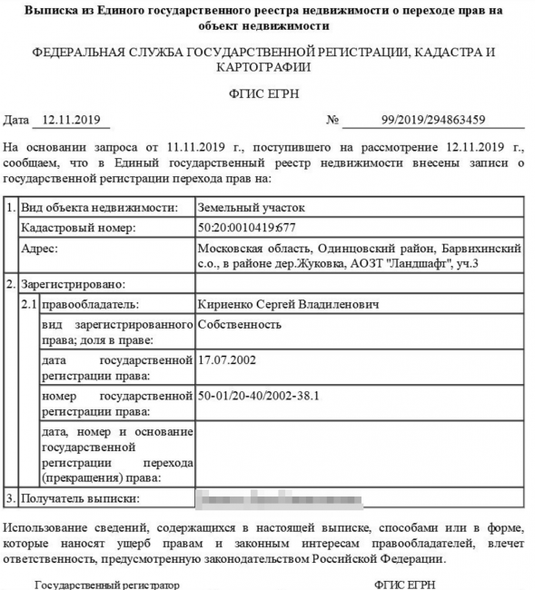 Площадь принадлежащего Кириенко участка составляет более 7 тысяч квадратных метров. Среди расположенных там объектов недвижимости — дом площадью 700 квадратных метров, спортивный комплекс и дом охраны. Точная стоимость участка неизвестна, однако, учитывая, что цена аналогичных участков на Рублевке колеблется от 900 млн до 1,7 млрд рублей, «Проект» предполагает, что все имущество Кириенко можно оценить в 1 млрд рублей.