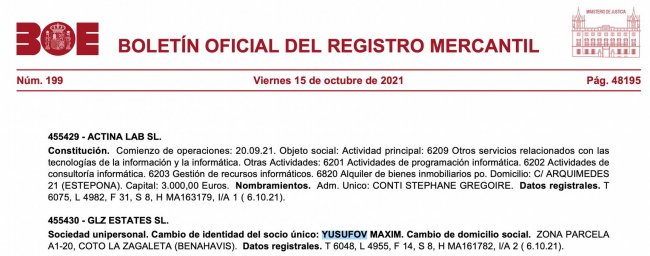 Имя Максима Юсуфова можно найти в бизнес-реестре Испании. Он возглавляет управляющую недвижимостью фирму GLZ ESTATES SL. в городке Бенаавис провинции Малага.