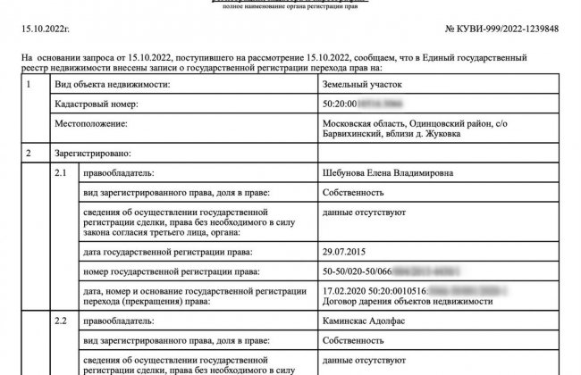 Согласно полученным из Росреестра данным, в 2020 году Шебунова подарила своему мужу имение в Жуковке. 5 октября 2022 года Адолфас Каминскас по договору дарения вернул недвижимость жене.