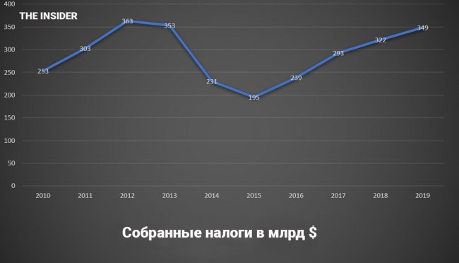 Мишустин возглавил ведомство в 2010 году — и уже в 2011 году началось внедрение новых технологий. В рублях рост налоговых поступлений выглядит эффектно, в среднем более чем по триллиону в год, — в период с 2012 по 2019 год поступления удвоились (с 11 до 22 трлн). Но это в рублях. В долларовом эквиваленте в России сегодня собирается меньше налогов, чем в 2012 году:
