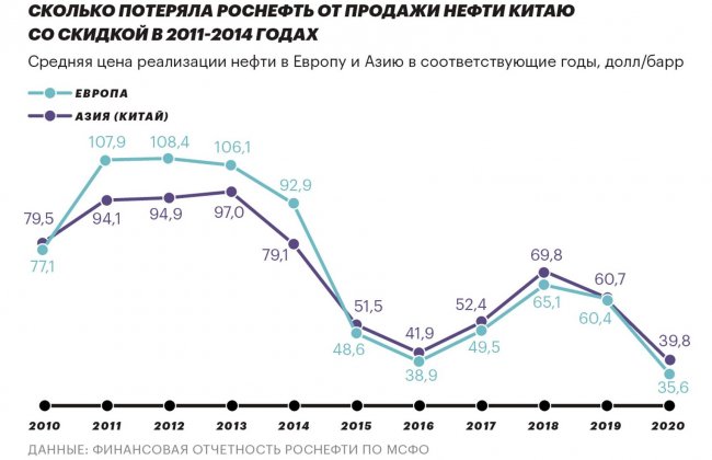 Благодаря строительству нефтепровода «Восточная Сибирь-Тихий океан» России удалось более успешно диверсифицировать экспорт в направлении Китая - сегодня он потребляет примерно 30% российской экспортной сырой нефти (более половины по прежнему - Европа), хотя всего 2% экспортных нефтепродуктов (2/3 экспорта нефтепродуктов идут в Европу). Но насколько это выгодно? С самого начала поставок нашей нефти в Китай «Роснефть» предоставляла КНР значительные льготы по цене, в результате которых, если посмотреть отчетность компании по международным стандартам, только прямые потери в результате более низких цен поставок нефти в Китай составили порядка $9 млрд: