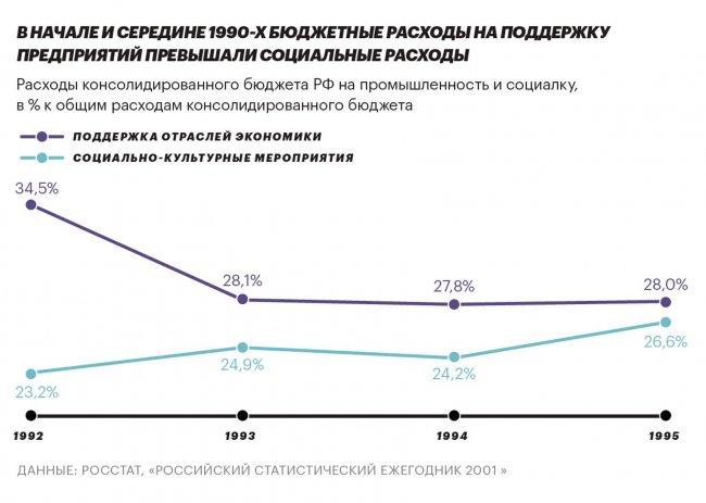 Последствия лоббизма «красных директоров» были ужасающими для страны. Благодаря им мы получили мягкую денежную политику Центробанка во главе с Виктором Геращенко (вот уж кто в куда большей степени ответственен за хаос начала 90-х, чем реформаторы из правительства), гиперинфляцию и «черный вторник» 1994-го (когда рубль в один день рухнул на 40%). Но еще один важный момент, о котором вообще практически не говорят, - именно предприятия, а не социальная сфера, в первой половине 1990-х выступали крупнейшими получателями бюджетной поддержки, которая заметно превышала социальные расходы: