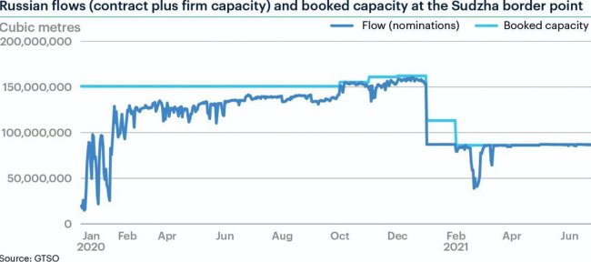 Но это только объективная, фундаментальная часть картины. Есть и подводная - связанная с откровенным манипулированием рынком со стороны «Газпрома». Прочувствовав надвигающуюся на европейский рынок ценовую бурю, российский монополист решил подлить масла в огонь, заняв позицию «мы удовлетворяем твердые контрактные обязательства» и де-факто отказавшись с июня исполнять дополнительные заявки потребителей и бронировать дополнительные трубопроводные мощности через Украину и Польшу. Как это выглядит, вы можете увидеть на графике ниже: