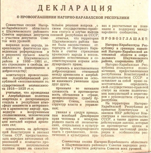 В итоге уже на закате Союза ССР армяне НКАО и Шаумяновского района провозгласили Нагорно-Карабахскую республику, а азербайджанские власти отменили автономию в своем составе. Свою лепту в урегулирование конфликта пытались внести и правозащитники, бывшие диссиденты. В 1988 году на раннем этапе противостояния группа академика Андрея Сахарова предлагала вариант территориального «разделения» двух кавказских республик. Некоторые созвучные мысли возникнут в 1992 году уже у американских экспертов. Но сахаровские идеи не стали предметом серьезного обсуждения. С распадом СССР этнополитический конфликт стал по умолчанию международным.