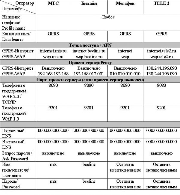 Важно! Если среди представленных операторов нет вашего или настройки не подходят (изменились), их всегда можно найти на официальном сайте оператора или получить, позвонив или отправив короткое смс-сообщение с соответствующей командой в службу технической поддержки.