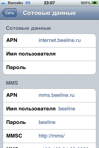 - APN – для сим-карты мобильного телефона internet.beeline.ru, для сим-карты USB-модема это home.beeline.ru;