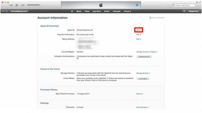 - поле «Apple ID» — в этом поле указан адрес электронной почты, к которому привязан идентификатор. Если пользователь хочет по-прежнему использовать существующий почтовый ящик в сервисах Apple, то его необходимо заменить на другой, но принадлежащий исключительно ему;