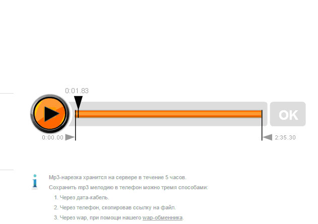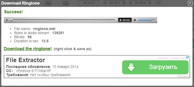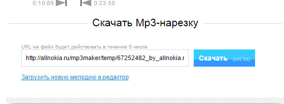 - затем появится окно, где будет представлена ссылка на скачивание готового рингтона.