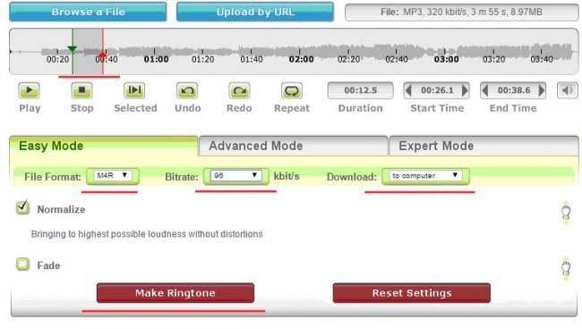 Процесс создания рингтона с помощью Make Own Ringtone: