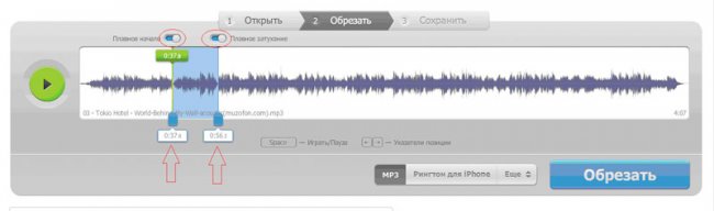- после того, как нужный файл был выбран, на странице появится окно, где можно обрезать файл до нужного временного интервала, а также добавить плавное начало и затухание в трек;