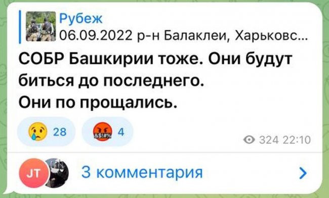 В 22:10 Telegram-канал «Рубеж» опубликовал следующий пост: «СОБР Башкирии тоже. Они будут биться до последнего. Они попрощались». Однако позже он был удален.