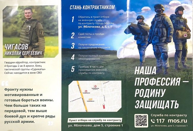 Агитация в таких точках очень похожа на предвыборную — здесь тоже есть призывно яркие листовки и не предлагается реальная альтернатива. В листовках рассказывают о преимуществах контрактной службы. На обложке буклета – группа из трех военных: солдата с оружием, медика, оператора беспилотника, держащего в руках небольшой дрон, похожий на иранский «Шахед» или, как его называют в России, «Герань».
