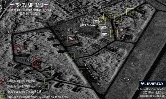 Два самолета Ил-76 сгорели полностью, еще два получили повреждения в результате атаки беспилотников на международный аэропорт Пскова, где базируется 334-й военно-транспортный авиационный полк 61-й воздушной армии, в ночь на 30 августа. Это следует из спутниковых снимков, опубликованных исследователем под ником MT Anderson.