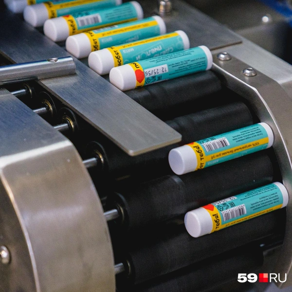 Производство устроено довольно просто — сначала в 24-литровых чанах смешивают и нагревают все ингредиенты, потом смесь отправляют в цех отлива, где специальная машина заполняет тюбики. Минуту они остывают, а потом уходят на обклейку, нанесение «Честного знака» и упаковку. Остается только рассортировать упаковки по картонным коробкам.