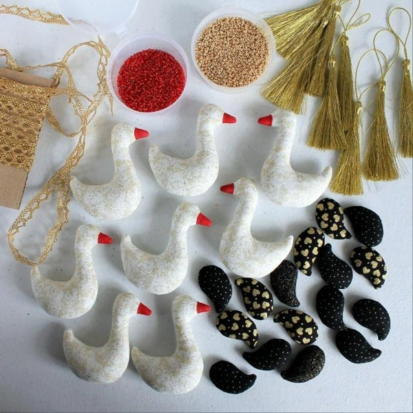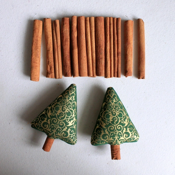 В основе каждой игрушки — ткань, американский хлопок. Его мастер предпочитает за качество, но и стоит материал недешево. Далее в ход идут бисер, стразы, материалы из металла, краска, стеклянные украшения. А в елочке роль ствола дерева играет палочка корицы — можно использовать как автомобильный ароматизатор.
