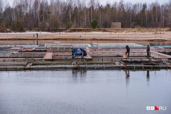 Садки осетровой фермы тянутся вдоль берега Камы. Осетров и стерлядь здесь выращивают круглый год, работа кипит даже зимой.