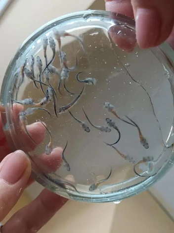 Проверка серьезная: рыбу отправляют на УЗИ и смотрят, все ли хорошо с икрой. Потом полученную икру оплодотворяют: смешивают с молоками самцов, а после помещают в специальные инкубаторы. Спустя неделю вылупляются предличинки.