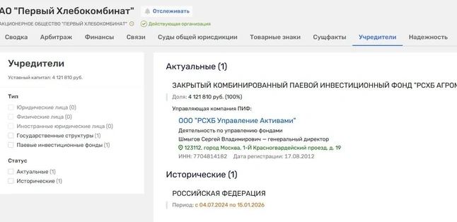 Закрытый комбинированный паевой инвестиционный фонд (ЗПИФ) «РСХБ АгроМ» стал единственным акционером АО «Первый хлебокомбинат», АО «Смак» (хлебокомбинат в Екатеринбурге), УК «М-Групп» (организация, управляющая АО «Макфа»), «Мишкинский продукт», «Арктика-Сервис» и еще десятка активов, изъятых у семьи Михаила Юревича в 2024 году. Информация обновилась в ЕГРЮЛ и сервисах проверки контрагентов в середине января 2026 года. Рассказываем, откуда взялся фонд, и спрашиваем юристов, что стоит за этой рокировкой.