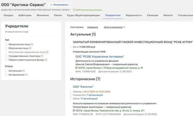 Новый учредитель появился у УК «Агромакфа» — с конца декабря 2025 года, у компаний «Эмитент Консалтинг», «Мишкинский продукт», «Мишкинский КХП», «Темп Интерсервис», «Просторы» и «Арком» — с 15 января 2026 года, у УК «М-Групп», АО «Новая Пятилетка», «Темп Автотех», «Арктика Сервис», «Экспресс-Карго», «Рамкон» — с 16 января 2026 года.